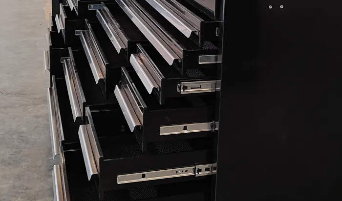 Đường ray trượt im lặng: Tủ công cụ đa chức năng màu đen có đường ray trượt im lặng nặng, với hành động kéo trơn tru và khả năng chịu tải mạnh.