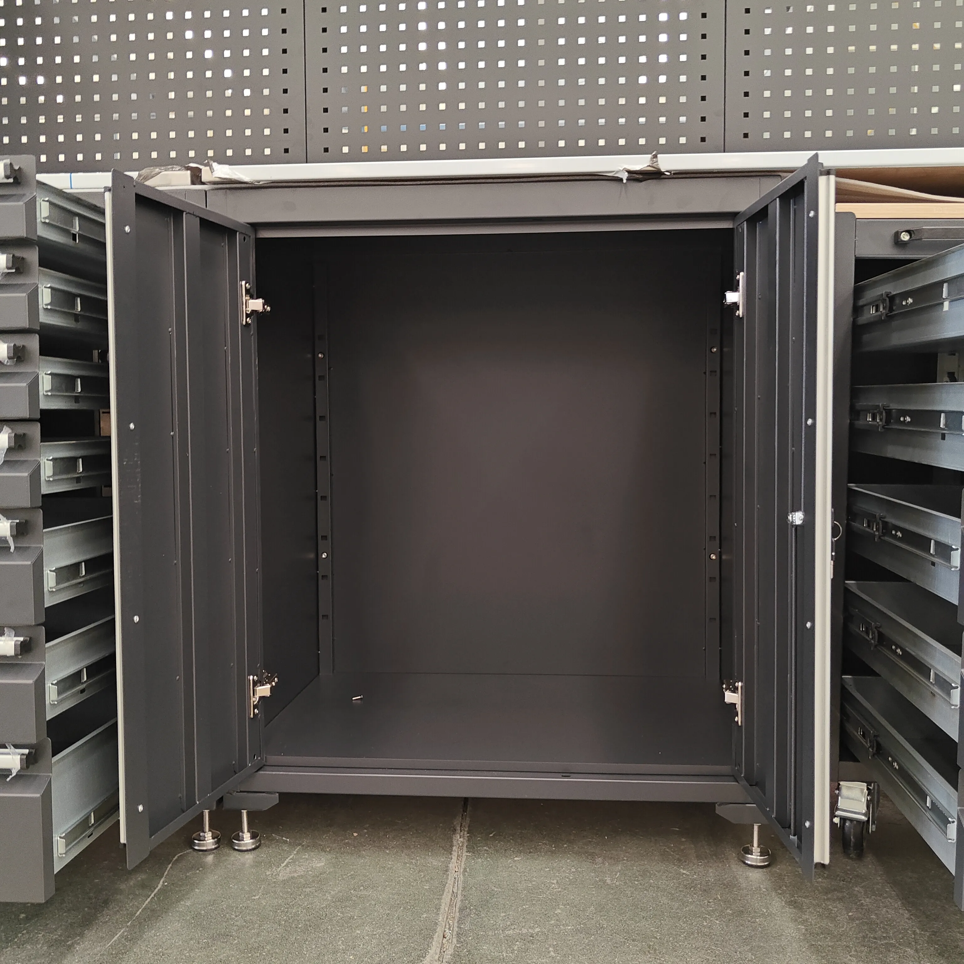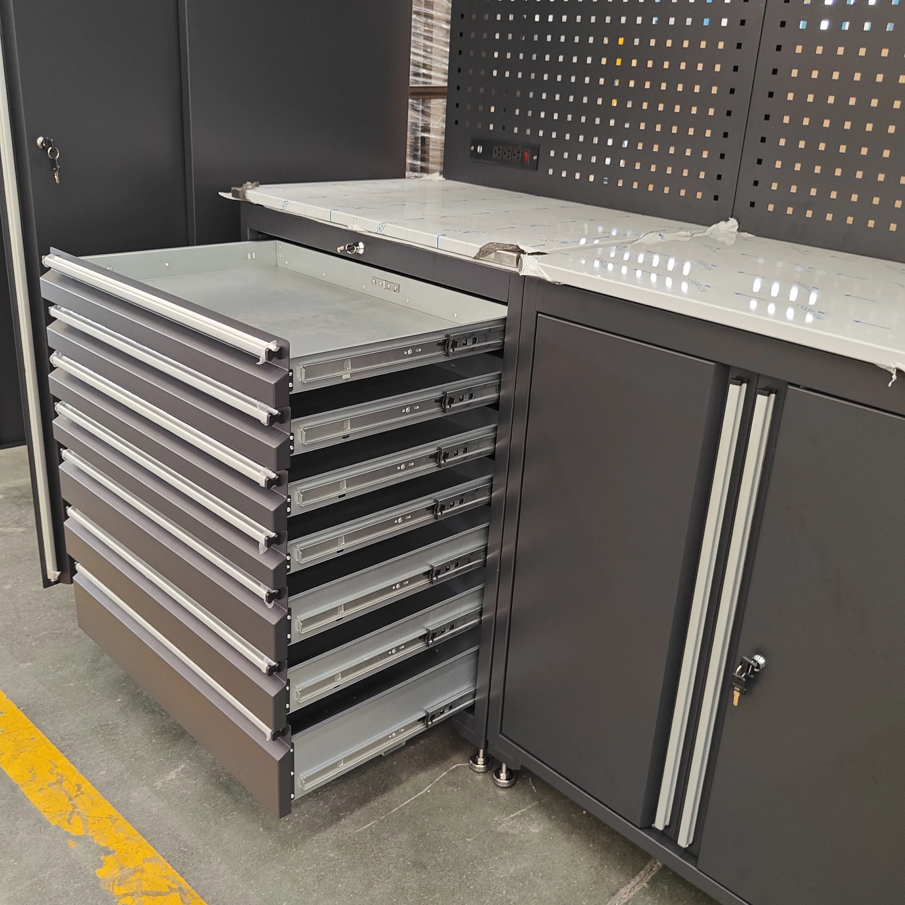 Các ngăn kéo của tủ công cụ hạng nặng được trang bị đường ray trượt im lặng, đảm bảo không có tiếng ồn khi mở hoặc đóng các ngăn kéo.