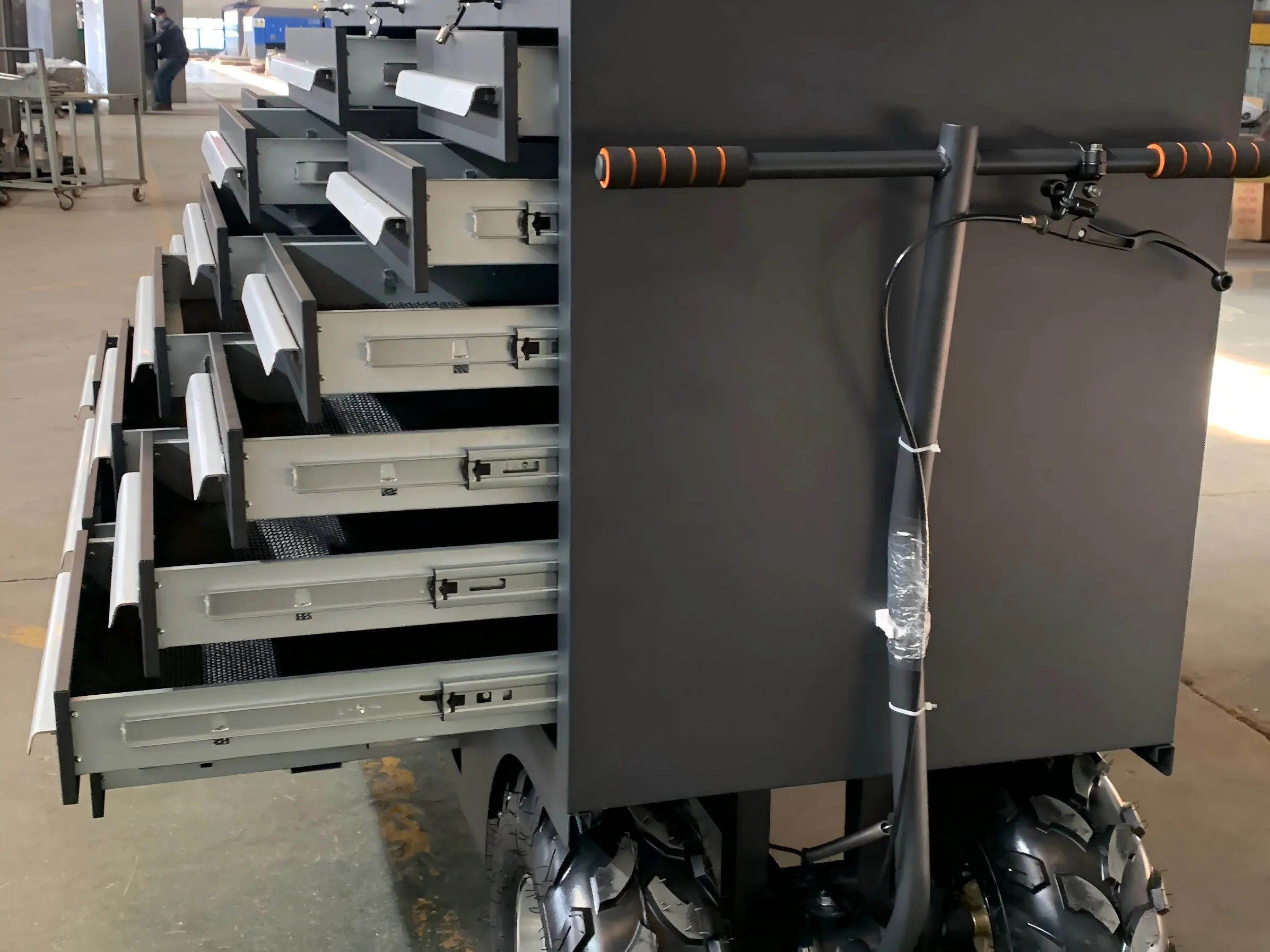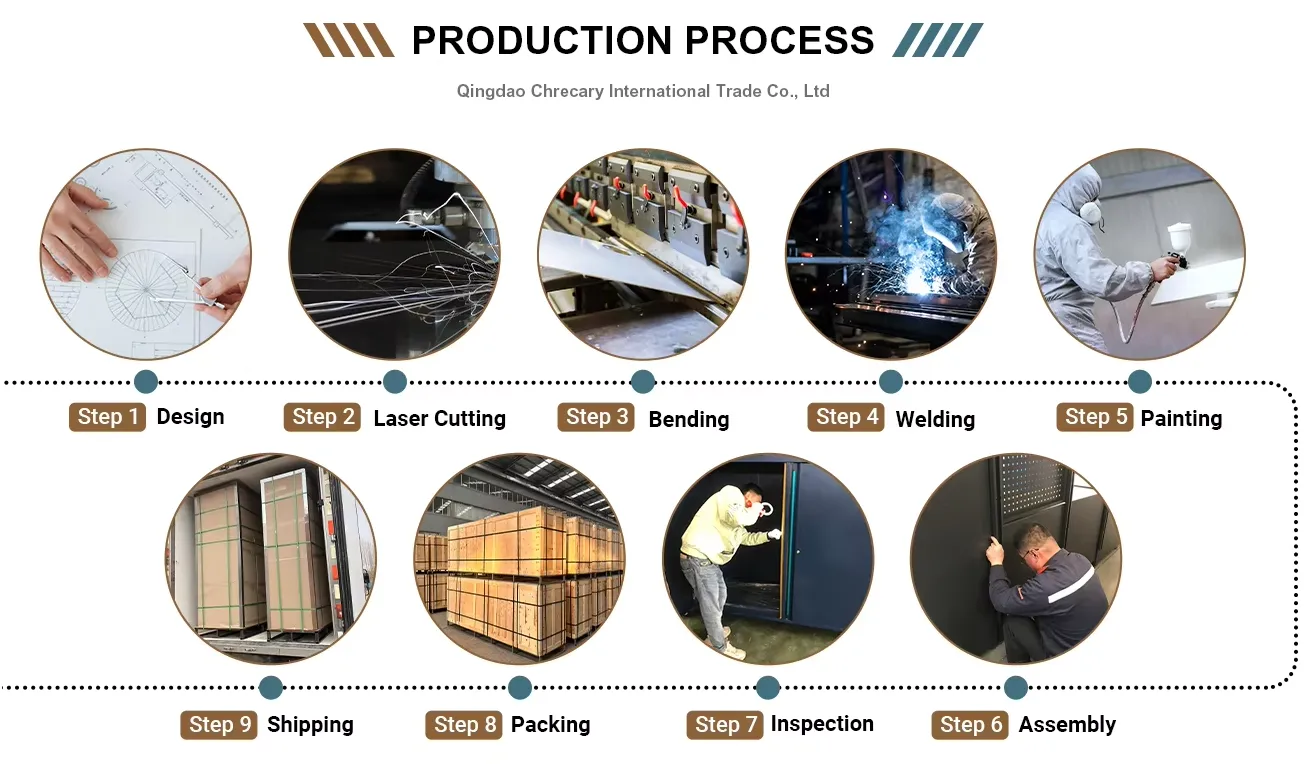 1. Mua sắm nguyên liệu thô: Các tấm thép cán lạnh chất lượng cao được chọn cẩn thận làm vật liệu chính để đảm bảo rằng sức mạnh vật liệu và độ bền đáp ứng các tiêu chuẩn cao. Đồng thời, các vật liệu phụ trợ chất lượng cao khác nhau được mua, chẳng hạn như các slide mang bóng cho ngăn kéo, khóa và bánh xe.