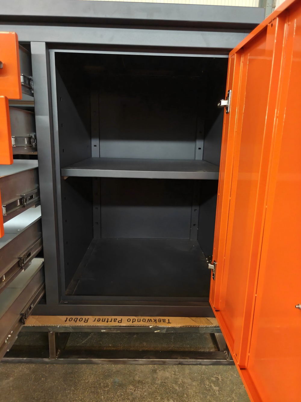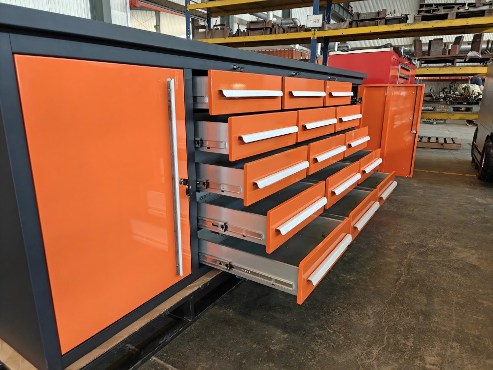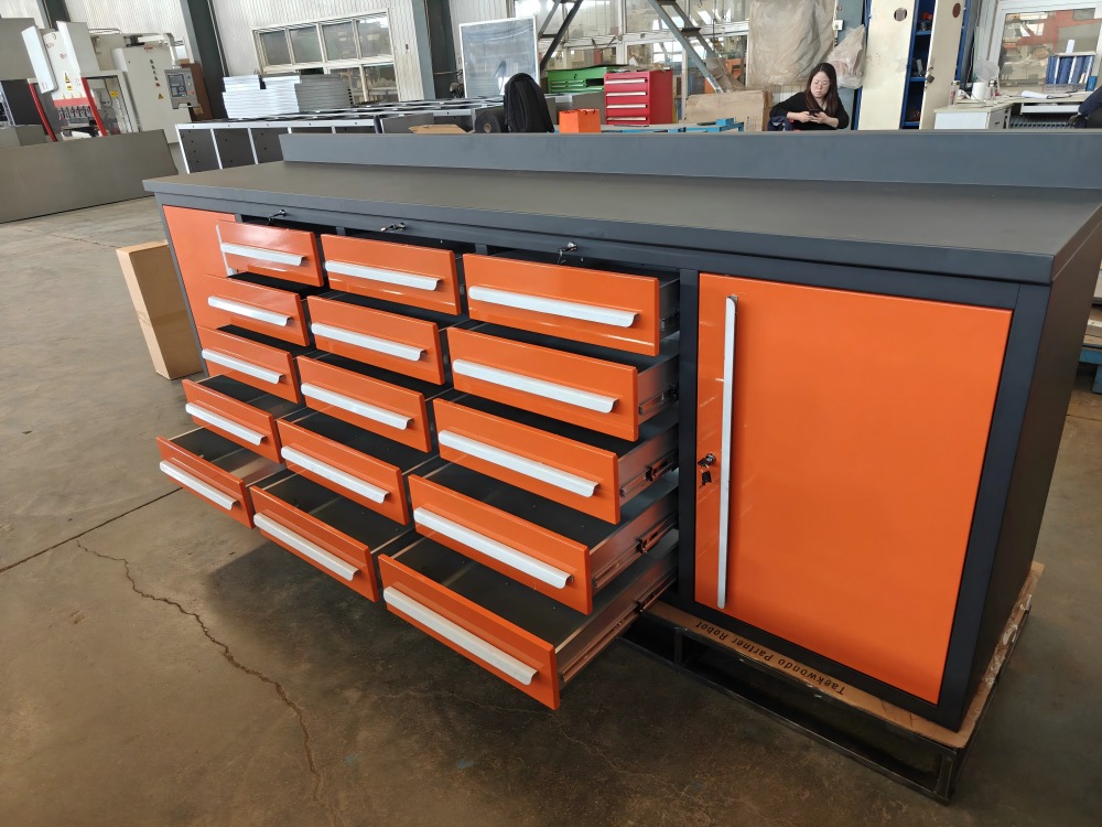 Bàn làm việc màu cam được làm bằng các tấm thép cán lạnh chất lượng cao, được hình thành bởi thiết bị CNC thông qua cắt, đấm, gấp, hàn và các quy trình khác. Bề mặt được xử lý bằng quá trình phun tĩnh điện tự động, vừa đẹp và bền. Các phân vùng ngang và dọc trong ngăn kéo của Workbench màu cam có thể được điều chỉnh tự do để hỗ trợ phân tách không gian theo kích thước của các mặt hàng. Hộp các bộ phận loại đơn vị cũng có thể được chọn để đạt được phân loại và lưu trữ tinh tế. Các đường ray ngăn kéo của Workbench màu cam được thiết kế với vòng bi chất lượng cao. Ngăn kéo đơn có khả năng tải 80kg và tỷ lệ mở 85%; Ngăn kéo theo dõi kép có công suất tải 140kg và tốc độ mở 100%, và nó linh hoạt và trơn tru để đẩy và kéo.